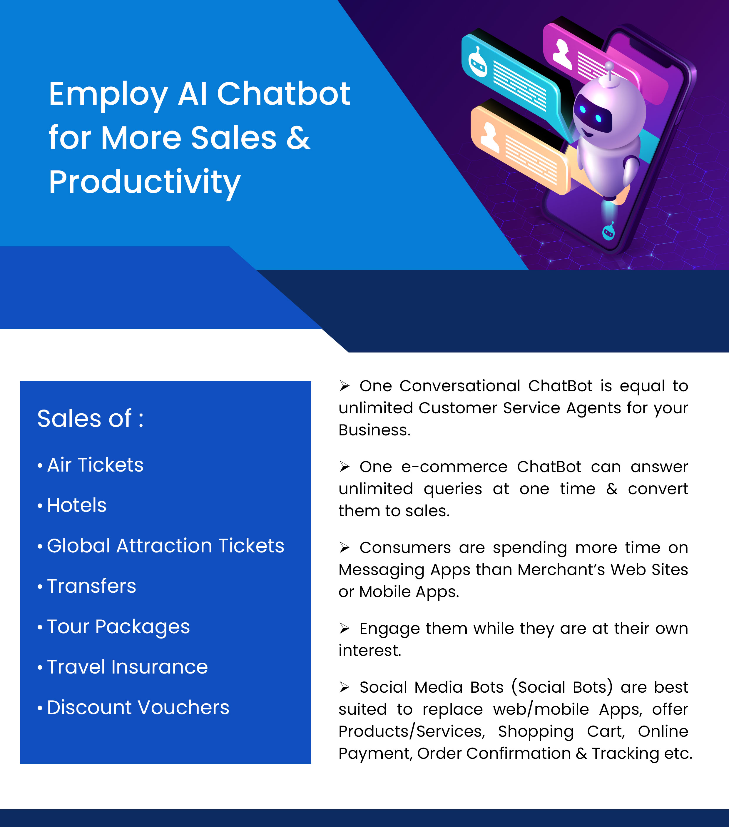 Chatbot provides enormous potential to drive sales to your e- commerce business. The number of online business that implement the Facebook Messenger chatbot is increasing each week. Messenger chatbots can help ecommerce to improve their customer experience and ultimately improve their sales.