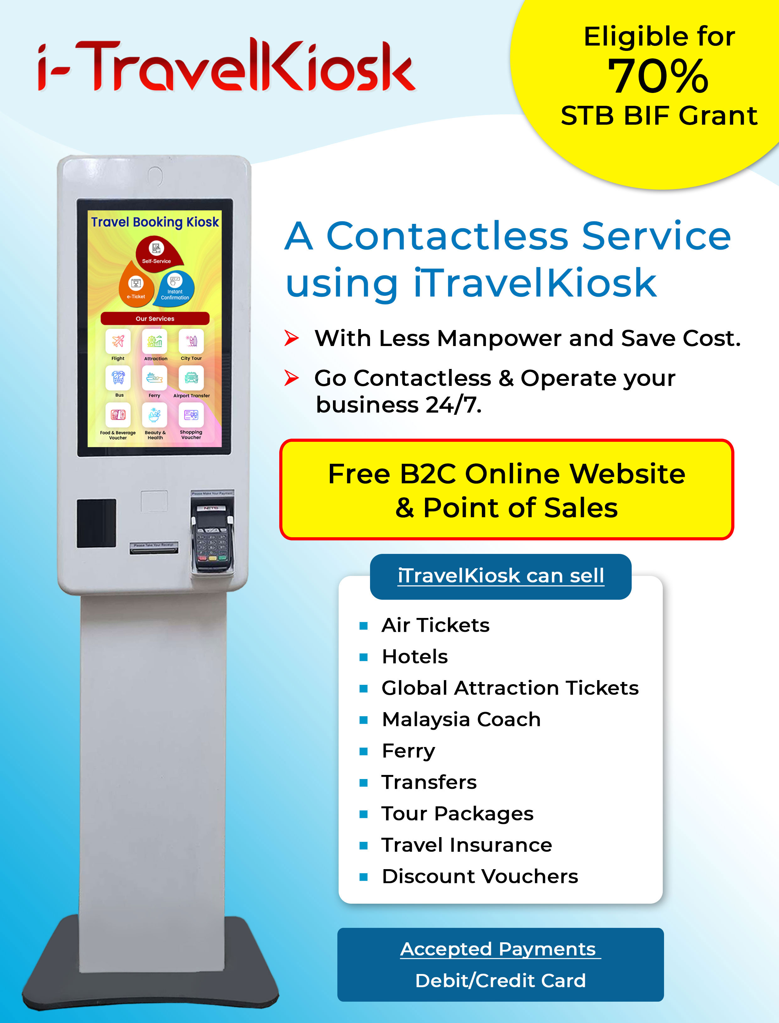 A Self-Service travel booking Kiosk with auto-ticketing. Travel Agents can install this kiosk at their door step to replace customer service agents. Passengers can enquire or book Air Tickets, Hotels, Attraction Tickets, City Tours, Coach Tickets, Ferry Tickets, Discount Vouchers, Travel Insurance, and many more. It can also be deployed in some public areas, hotels, restaurants, shopping malls, office buildings, universities, bus/ferry/airport terminals, petrol stations. It can also make passive income from the advertisement banners.